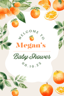 We started with the invitation since that really helped shape the rest of the party. The shower was at a close family friend’s house, so we kept the invite fun and relaxed but still thoughtful. The design featured a sweet repeat pattern of oranges and greenery to match the cutie theme, along with all the important info: mom-to-be’s name, date and time, hosts, registry, and how to RSVP.
